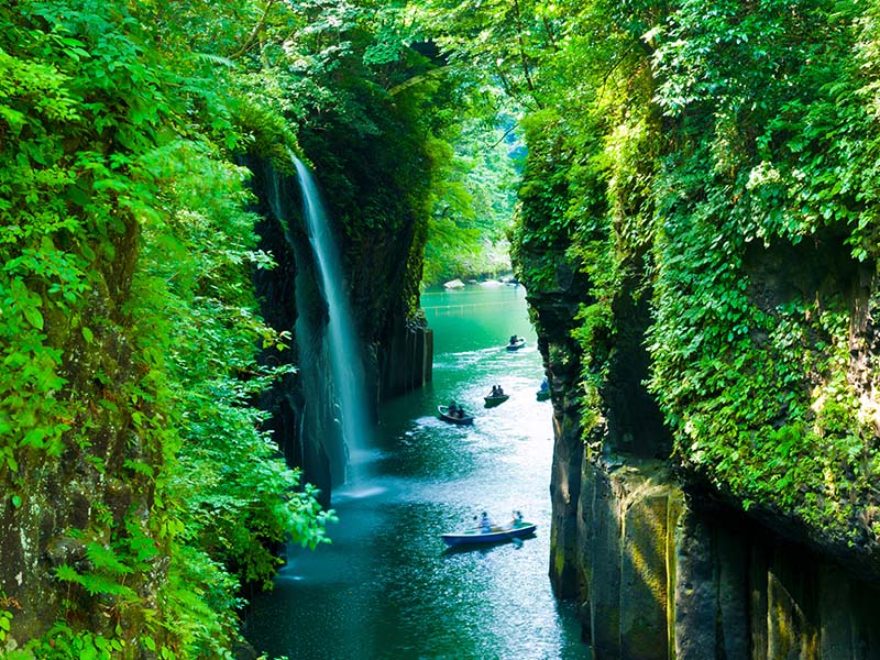 高千穂峡では、渓谷美や滝を堪能でき、神秘的な雰囲気が広がります。