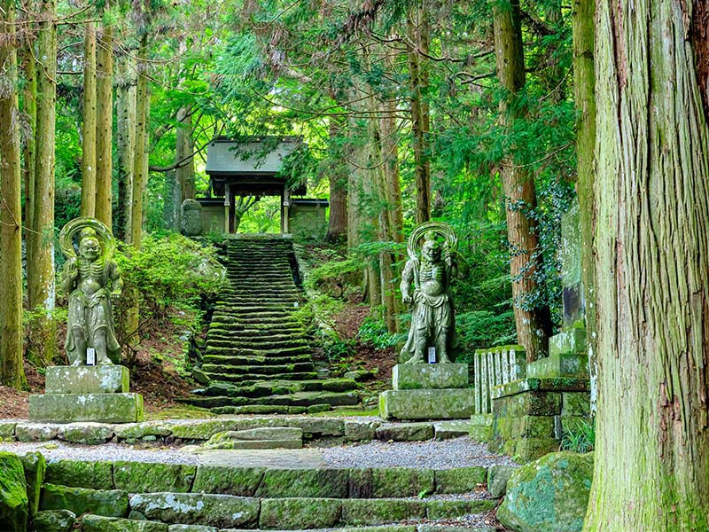 両子寺では苔むす参道や静寂に包まれた伽藍が印象的で、文殊仙寺では古くから続く修験の空気に触れられます。