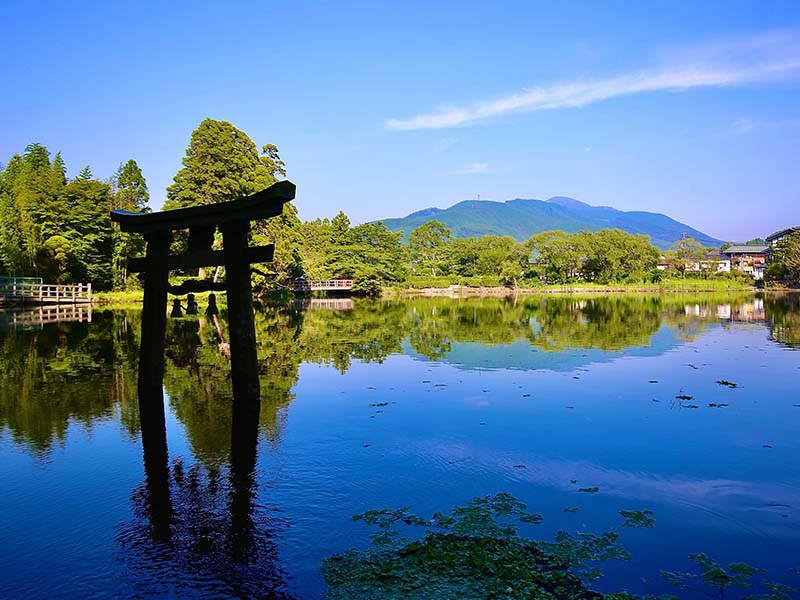 由布岳の美しい稜線が町並みに寄り添い、朝霧に包まれる金鱗湖は四季ごとに異なる表情を見せます。