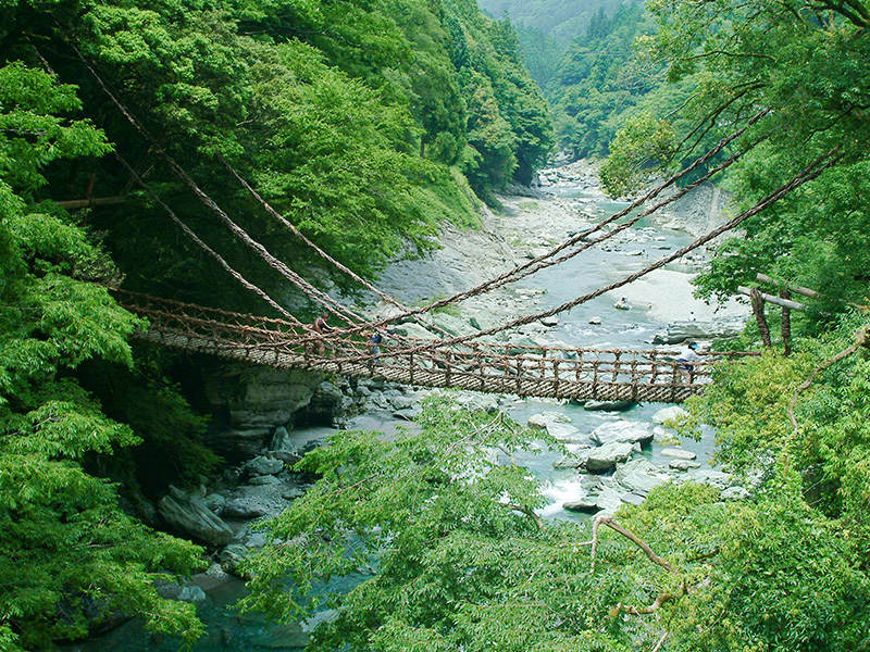 V字谷が続く祖谷渓では、断崖絶壁に立つ「祖谷の小便小僧」や、野趣あふれる「かずら橋」が訪れる人に驚きと感動を与えます。
