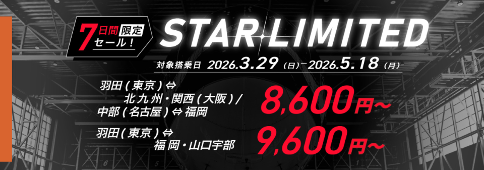 スターフライヤー(SFJ)より、「7日間限定セール!STAR LIMITED」のお知らせです。