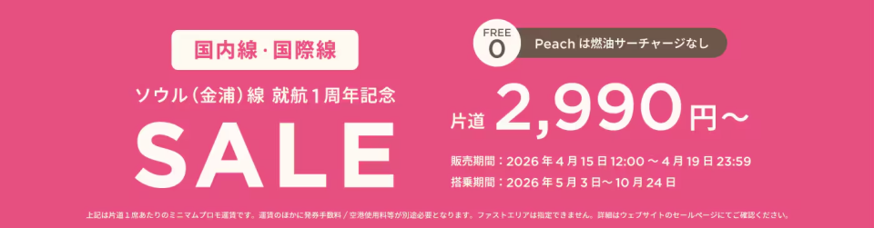 ピーチ(Peach/MM)にて、「国内線対象、ソウル(金浦)線就航1周年記念セール」のお知らせです。