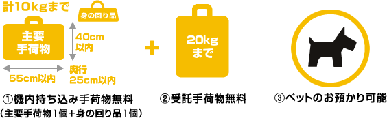 ※特に注意が必要な手荷物について詳しくはこちらをご確認ください。 - ペットのお預かりは可能です。お預かり数には制限がございます。ご予約の際は、必ずスカイマーク(SKY)予約センターまでお知らせください。ペットのお預けについて、詳しくはこちらをご確認ください。